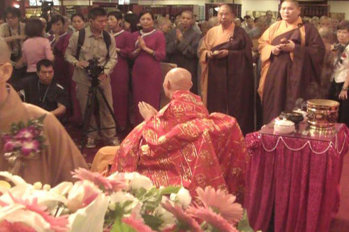 在漢傳佛教的法會中,為了法會整齊莊嚴,會儘量要求大眾統一穿著一種很大的袖子的衣袍,這種衣袍稱作”海青”,是中國古代傳統的禮服。海青是一種鳥類的名稱,常常在海邊飛翔,因為此衣袍寬闊的長袖揮展開來就像飛翔的海青鳥一般,所以此衣袍就稱作《海青》、又稱作《大袍》。